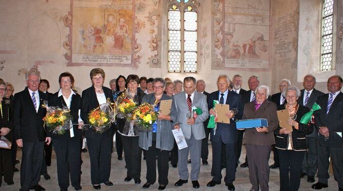 Insgesamt elf Mitglieder konnten am Sonntagmorgen für ihre langjährige Treue zum Verein geehrt werden. Bereits seit 1950 gehört Fritz Bleher zum Liederkranz. Er ist inzwischen Ehrenmitglied und wurde jetzt für 60 Jahre Vereinstreue ausgezeichnet.