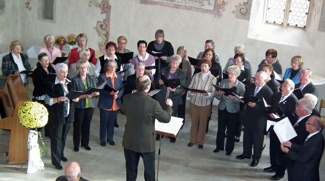 Herbstliche Volksweisen standen im Mittelpunkt des sonntäglichen Singens, und die tiefstehende Herbstsonne warf ihr Licht verschwenderisch durch die teils farbigen Kirchenfenster. Chorleiter Robert Wieland lud die Gäste auch zum Mitsingen ein und hatte mit seiner kurzen Anleitung zu »Bunt sind schon die Wälder« und zu dem Kanon »Hejo! Spannt den Wagen an« sogleich Erfolg; das Publikum sang bei sauberem Einsatz gut mit.