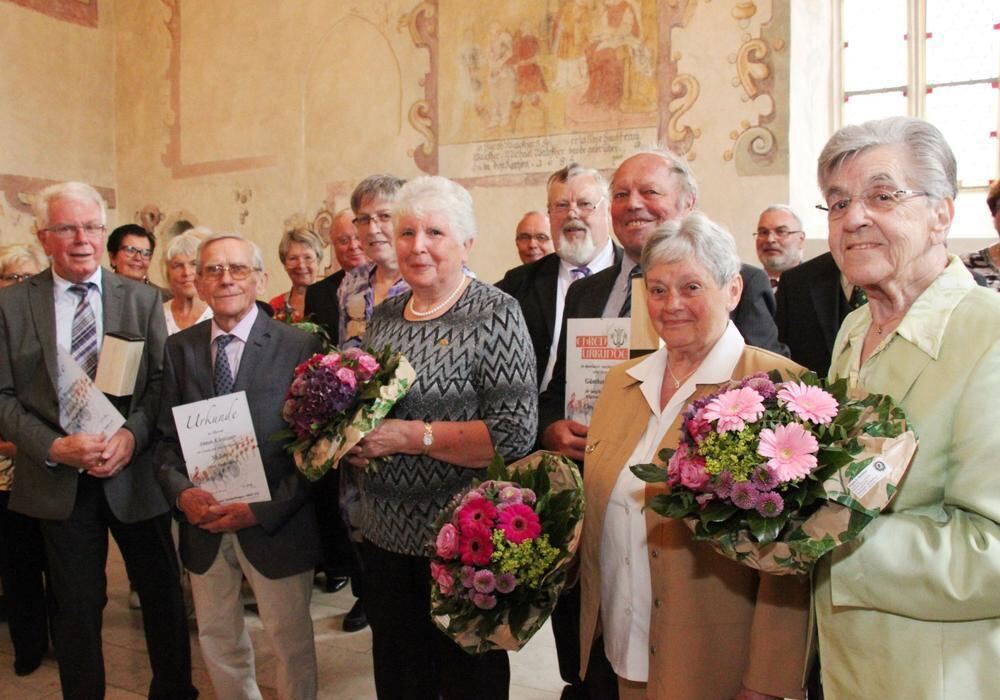 Ebenfalls geehrt wurde am gestrigen Sonntag im schönen Ambiente der Stephanuskirche Ilse Schmid. Sie singt bereits seit 50 Jahren aktiv im Chor. Aber eben nicht nur in Sondelfingen. »Doch auch bei uns sind es schon fast zehn Jahre«, betonte Benkele. Ebenfalls 50 Jahre im Verein ist Karl-Ulrich Ruggaber: Der ehemalige Vereinsvorsitzende wurde vom neuen Vorstand nicht nur dafür mit Urkunde und Wein geehrt, sondern obendrein erhielt Ruggaber auch noch den Sängerring für 30-jähriges aktives Singen im Liederkranz. Obwohl Lothar Benkele augenzwinkernd darauf hinwies, dass ihm »der Ring auch passen würde«, gab er ihn schließlich doch weiter an den Geehrten. Bei der Würdigung passiver Mitglieder konnte einzig Frieda Ziegler für ihre 40-jährige Treue geehrt werden – Hugo Geiger, Otto Ziegler und Peter Hipp hatten sich krankheitshalber abgemeldet. Anton Kleiszner wurde für 50 Jahre Mitgliedschaft geehrt, davon war er 19 Jahre aktiver Sänger.