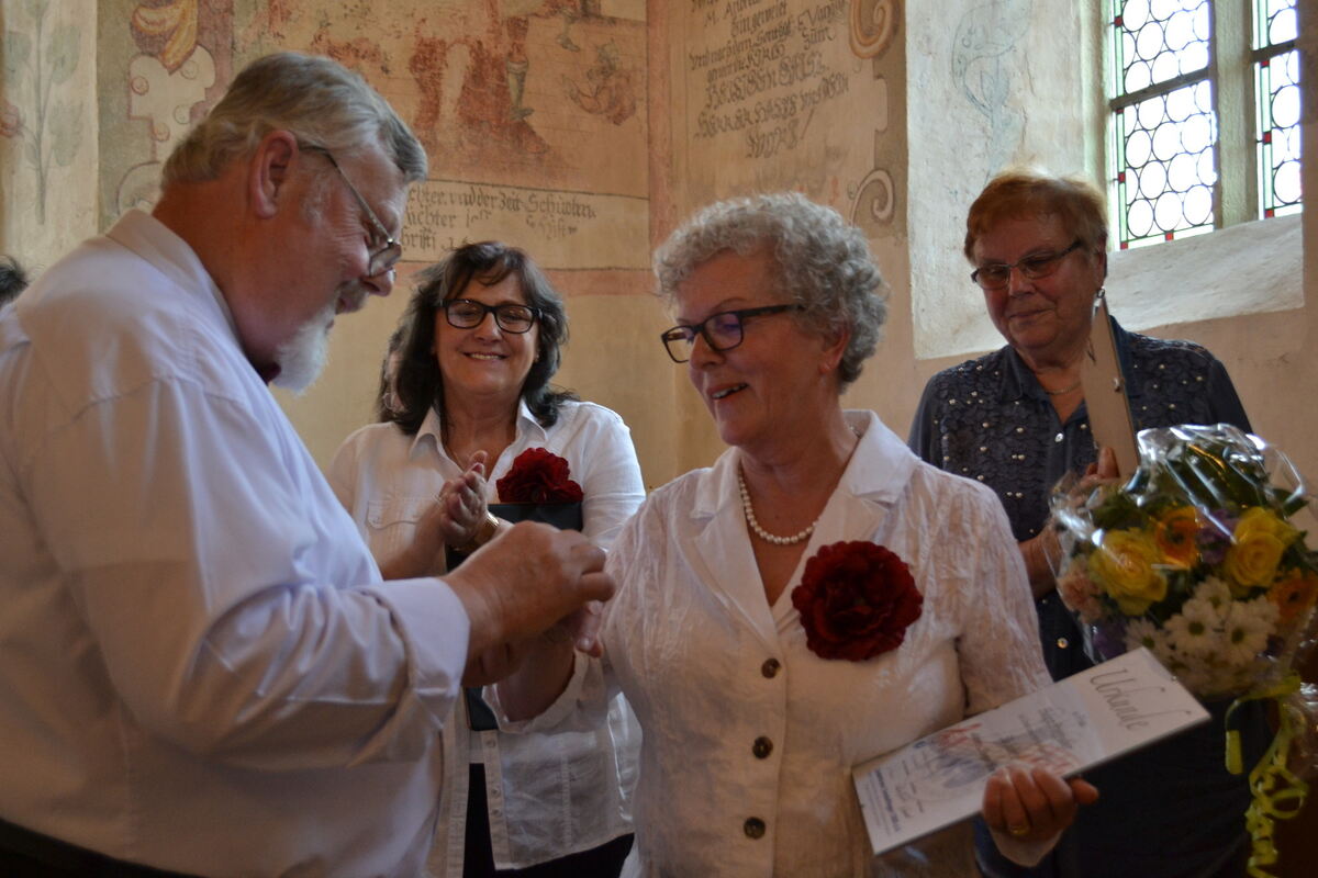 Ein weiteres Frühlingsgedicht leitete über zur »Reise ins Glück«, an der sich wieder jedermann stimmlich beteiligte. Eugen Markucik baute schließlich mit »Hallo, schönes Fräulein« die textlich ideale Brücke zu den Ehrungen. Schließlich wurden mit Waltraud Felder (10 Jahre Mitgliedschaft) und Helga Ruggaber (30 Jahre) zwei im Chor aktive Damen geehrt. Helga Ruggaber bekam von Rudolf Ruszat als besondere Auszeichnung den goldenen Ring des Liederkranzes angesteckt. Für passive Mitgliedschaft sollten Ursula Schönweitz (40 Jahre Mitgliedschaft), Bernd Veith (50 Jahre) sowie Willi Barth und Ferdinand Veith (je 60 Jahre) ausgezeichnet werden. Von den »Passiven« war allerdings nur Bernd Veith in die Stephanuskirche gekommen.